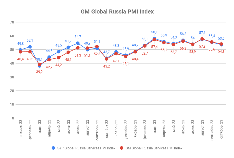 Октябрьское значение индекса деловой активности ГлобалМедиа PMI (GM Global Services Russia PMI Index) составило 54,1 п.п. против 55,6 п.п. в сентябре. Значение индекса деловой активности в сфере услуг от S&P Global (Global Russia Services PMI by the S&P Global) за аналогичный период снизилось с 55,4 п.п. до 53,6 п.п.