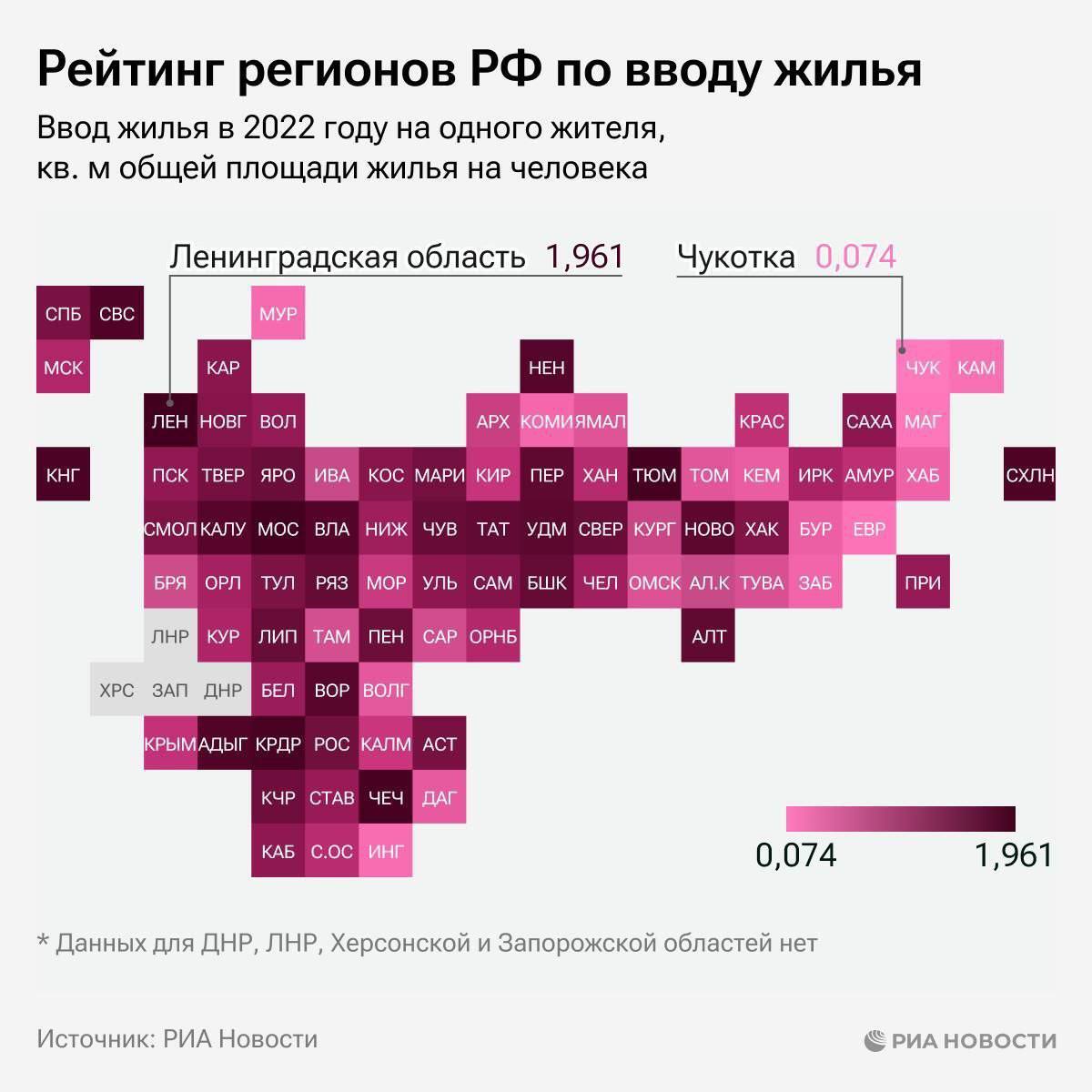 В Ленобласти на каждого жителя региона пришлось 1,961 кв.м введенного жилья, общий объем построенной жилой площади составил почти 4 млн кв. м. В Мособласть на втором месте с показателями 1,641 кв. м и 14,096 млн кв. м соответственно, на третьем месте — Тюменская область, где в среднем на каждого жителя пришлось 1,396 кв.м, а в целом за год введено 2,245 млн кв. м жилья.