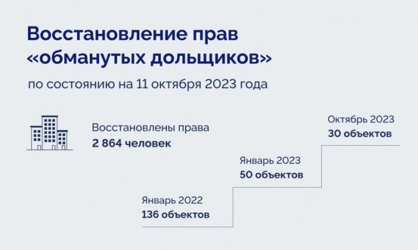 "За 2022 год и девять месяцев 2023 года в Уральском федеральном округе восстановлены права 2864 человек дольщиков. Число проблемных объектов в ЕРПО сократилось до 30. Органам власти всех уровней вместе с ППК "Фонд развития территорий" предстоит исключить их из реестра и восстановить права менее двух тысяч человек", – подчеркнул Владимир Якушев.