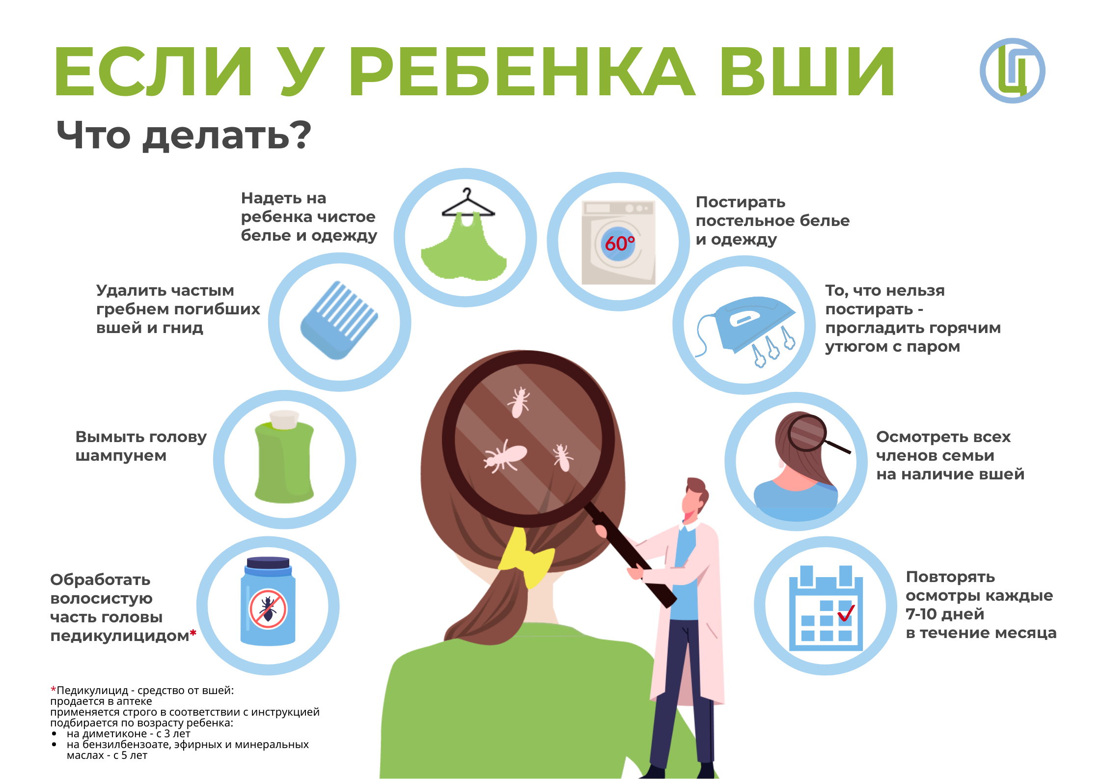 • Проводите периодический осмотр волос и одежды у детей, посещающих детские учреждения.