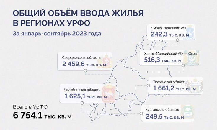 За январь-сентябрь в Уральском федеральном округе новых проектов строительства многоквартирных домов заявлено на 3,73 миллиона квадратных метров (на 39% больше, чем за аналогичный период прошлого года).
