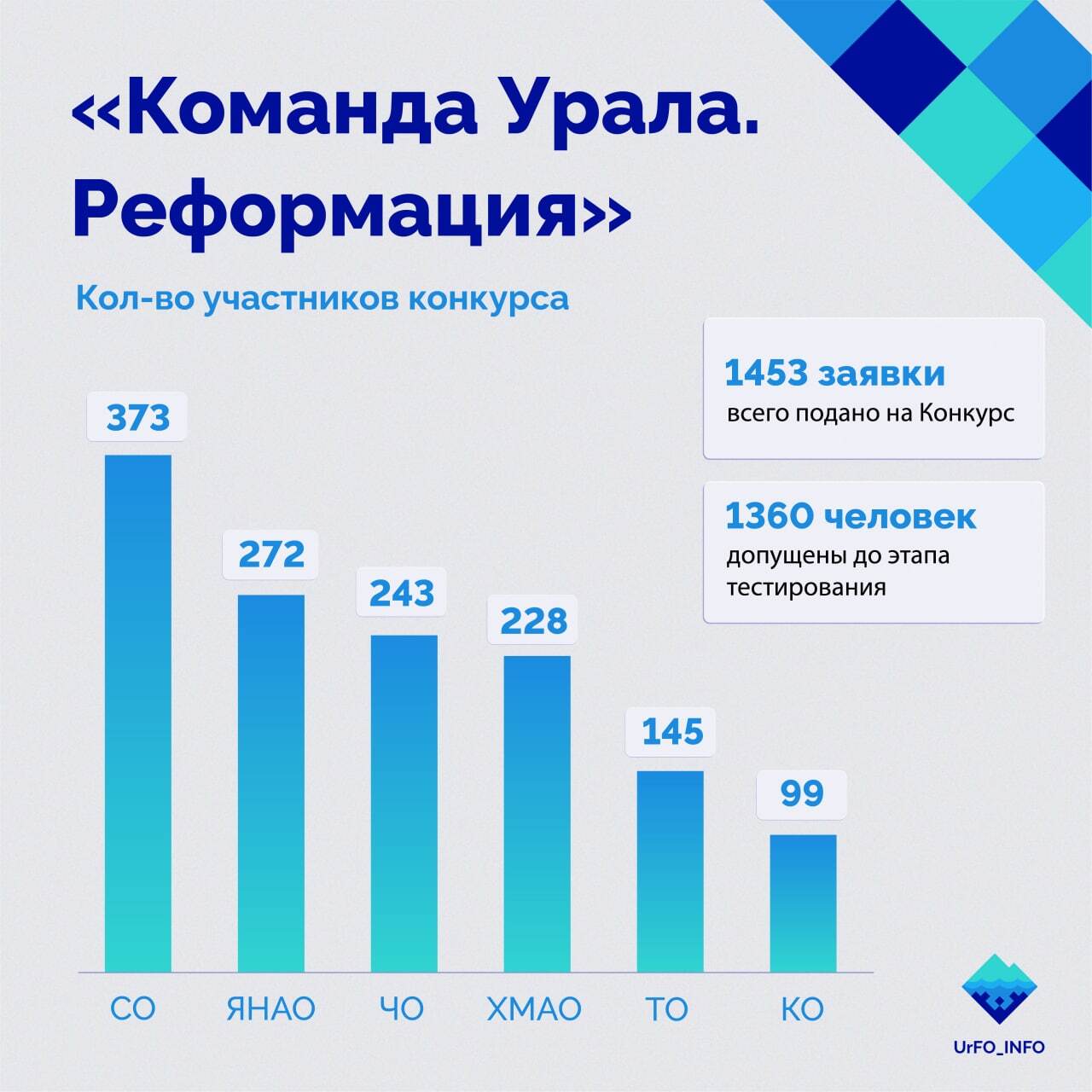 На конкурс "Команда Урала. Реформация" было подано 1 453 заявки. После проверки данных конкурсантов на соответствие заявленным условиям к тестированию допущено 1 360 человек.