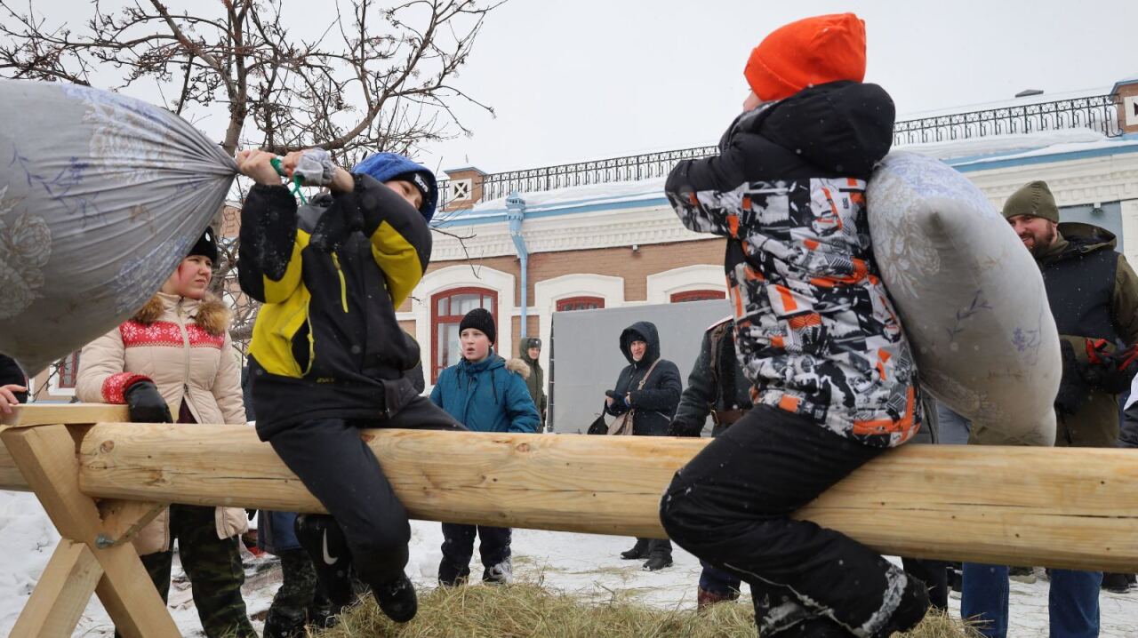 Народные гулянья в России не обходятся без молодецких забав. Вот и сегодня сильные и ловкие смогли проявить себя на соревнованиях "Взятие КАЗАК-горы", "Стенка на стенку" и др. Самые отчаянные берут высоту на масленичном столбе. Наверху разнообразные призы!