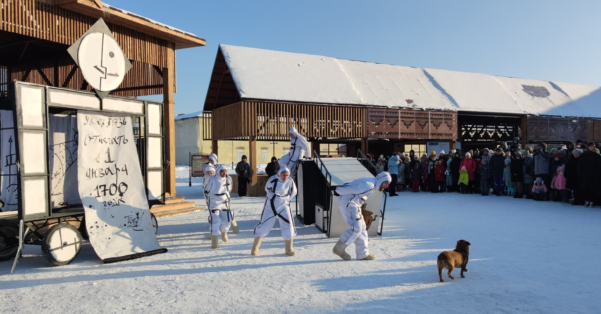 Чёрно-белый комикс, образы которого, придуманные художницей Натальей Михеевой, вобрали в себя и традиционные русские орнаменты, и языческую роспись, и даже живопись Малевича, повеселил собравшихся на Базарной площади историей о том, как Россия переходила на новое летоисчисление. Велел царь Пётр праздновать Новый год 1 января, да вызвал сей указ у народа недоумение. Впрочем, народ русский на выдумку богат, а ещё весел и задорен, а значит, новогоднее празднование удастся: и с горки ледяной скатятся, и пельменями горячими угостятся.