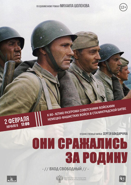 - 2 февраля в 17-00 часов в рамках празднования 80-летия разгрома вражеских войск в Сталинградской битве в кинозале "Пеликан" состоится бесплатный показ художественного фильма Сергея Бондарчука по одноименному роману Михаила Шолохова «Они сражались за Родину». Дата и время выбраны не случайно, они символизируют 200 дней и ночей Сталинградской битвы, — сообщила Юлия Керн, специалист по методике клубной работы МАУК «Овация».