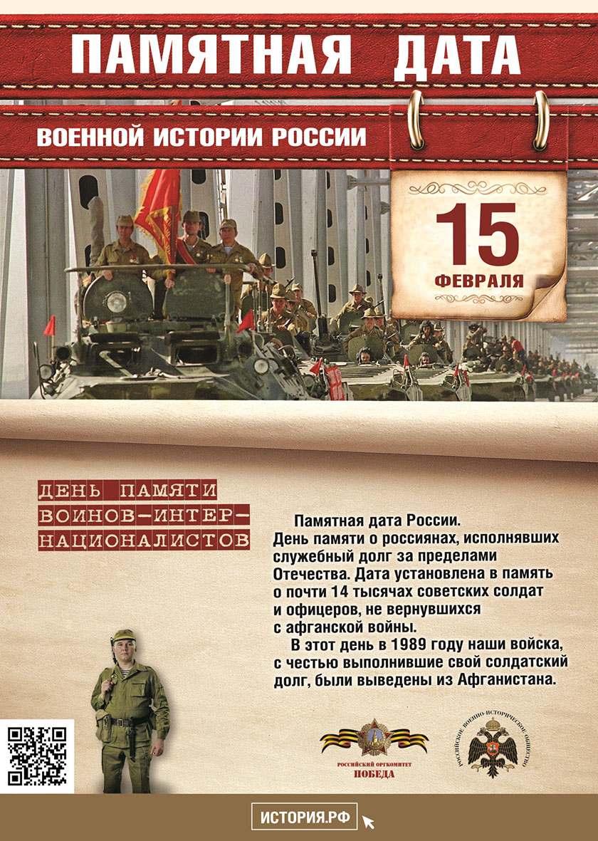 В этот день в 1989 году советские войска, с честью выполнившие свой солдатский долг, были выведены из Афганистана. Дата установлена в память о почти 14 тысячах советских солдат и офицеров, не вернувшихся с Афганской войны.