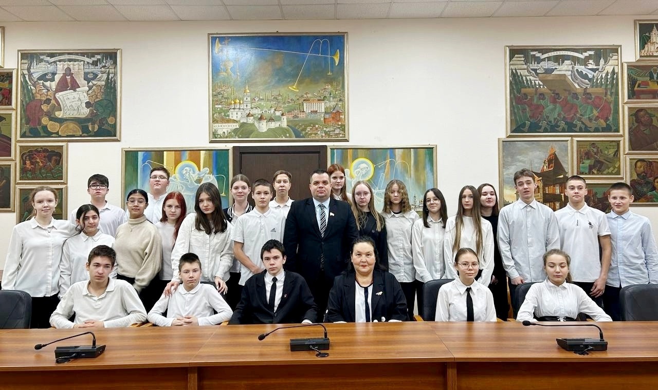 Депутат провёл общественный урок для учащихся 8Г класса школы №18 в малом зале думы и рассказал об истории становления и развития представительного органа местного самоуправления.