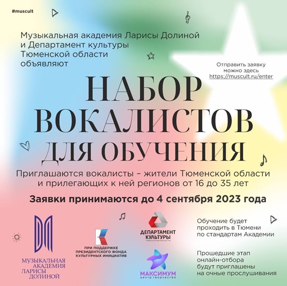 Продлена регистрация на Обучающий интенсив для вокалистов до 04 сентября 2023 года, для участия необходимо заполнить заявку-анкету на официальном сайте Музыкальной Академии Ларисы Долиной https://muscult.ru/enter