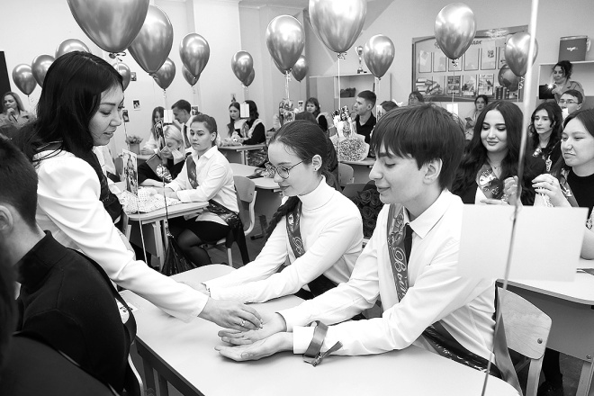 На последнем звонке в пятницу учителя объявили: «На каждую пяточку по заколдованному пятачку!» и раздали монетки. Учитель Сауле Жакупова для своего 11-го «В» монеты помыла и натерла, чтобы блестели. И сказала напутственные слова. Было трогательно, кое-кто не сдержал слез, особенно родители, которые толпились у дверей класса, как одиннадцать лет назад.