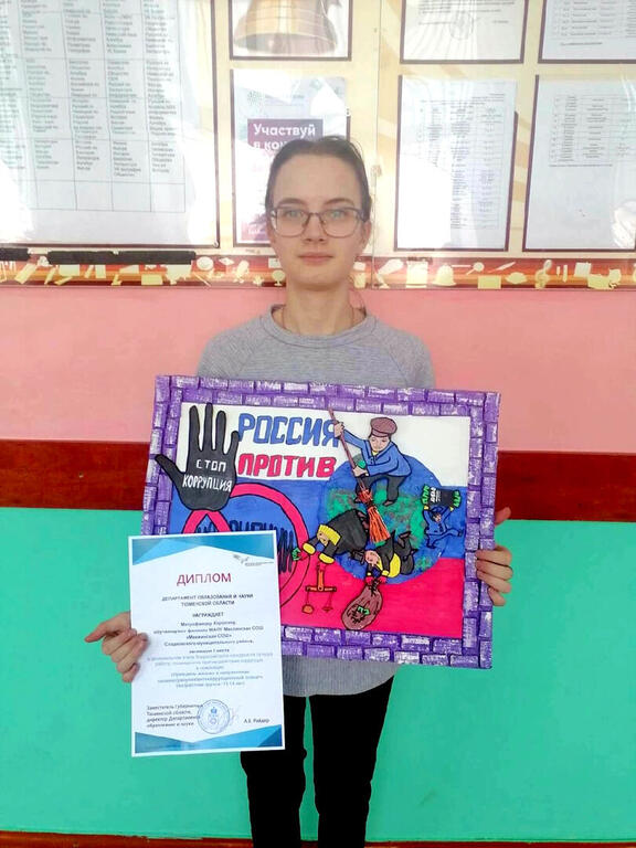 Дипломом Департамента образования и науки Тюменской области награждена ученица 11 класса Менжинской средней школы Каролина Митрофанова, занявшая первое место в номинации «Принципы жизни» в направлении «комикс/рисунок/антикоррупционный плакат».