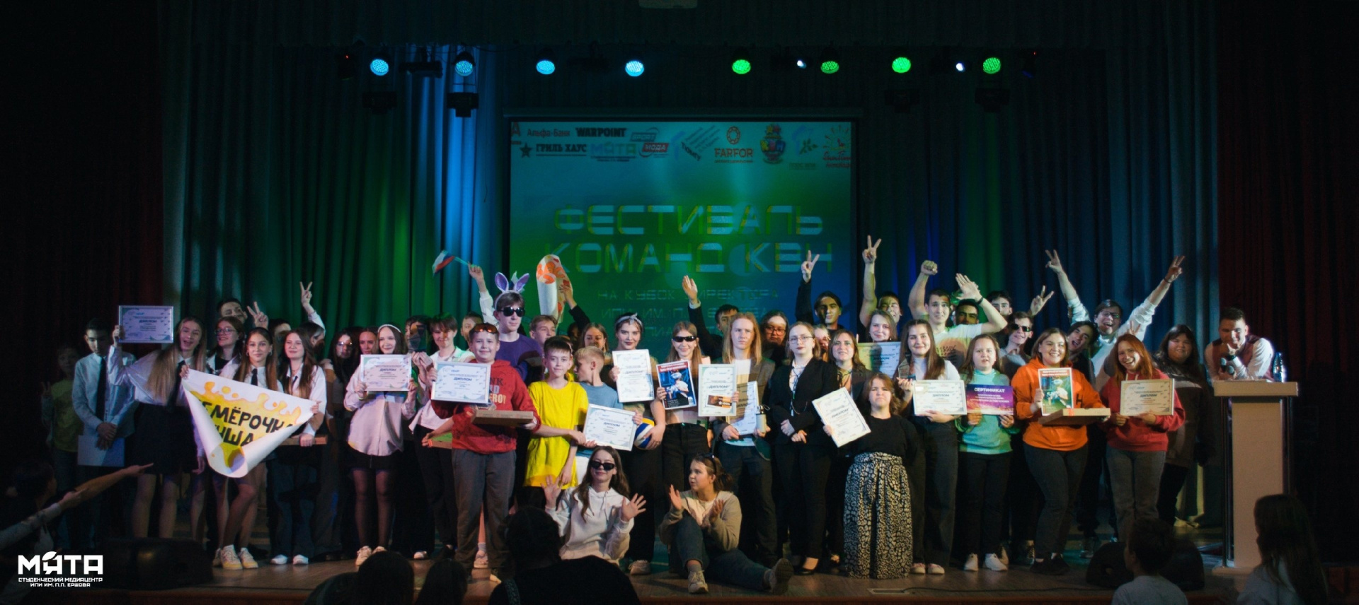 Спонсоры и партнёры фестиваля: Альфа-Банк Пионер лига КВН Первичная профсоюзная организация студентов ИПИ Ресторан Гриль Хаус Ресторан FARFOR - https://ishim.farfor.ru Магазин спортивной одежды Спорт Мода - https://www.sportmoda.ru Арена виртуальной реальности WARPOINT Антикафе "SunTime" Благодарим все команды за проявленную активность и поздравляем победителей фестиваля!