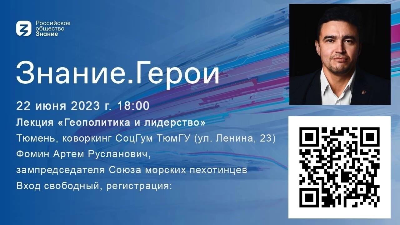 Лекция на тему "Геополитика и лидерство" состоится 22 июня в Тюмени в рамках Всероссийской военно-патриотической просветительской акции "Знание.Герои". Спикером выступит заместитель председателя Союза морских пехотинцев, лектор Российского общества "Знание" Артём Фомин .