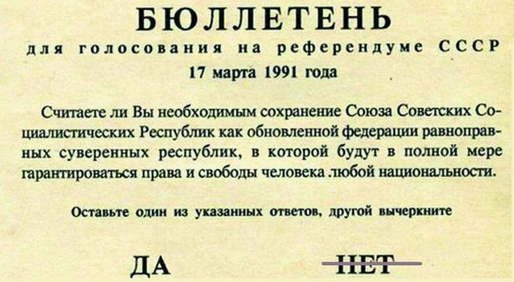 Недавно мы, советские люди, отметили 100-летие со дня образования нашей социалистической Родины – Советского Союза. Дальше приходится вспоминать 17 марта 1991 года, я напоминаю читателю о референдуме, который выразил волю народа. За сохранение Союза высказались 113 млн. или 76% проголосовавших по всей стране. Плюс ещё 2 млн. советских людей, которые потребовали учесть их голоса в республиках, не принявших официального участия в голосовании. Тогда же 21 марта 1991 года Верховный Совет СССР утвердил итоги референдума. Постановление Верховного Совета СССР гласило: «Государственным органам Союза СССР и Республик руководствоваться в своей деятельности решением народа, принятым путем референдума в поддержку обновленного Союза Советских Социалистических Республик, исходя из того, что это решение является окончательным и имеет обязательную силу на всей территории СССР».