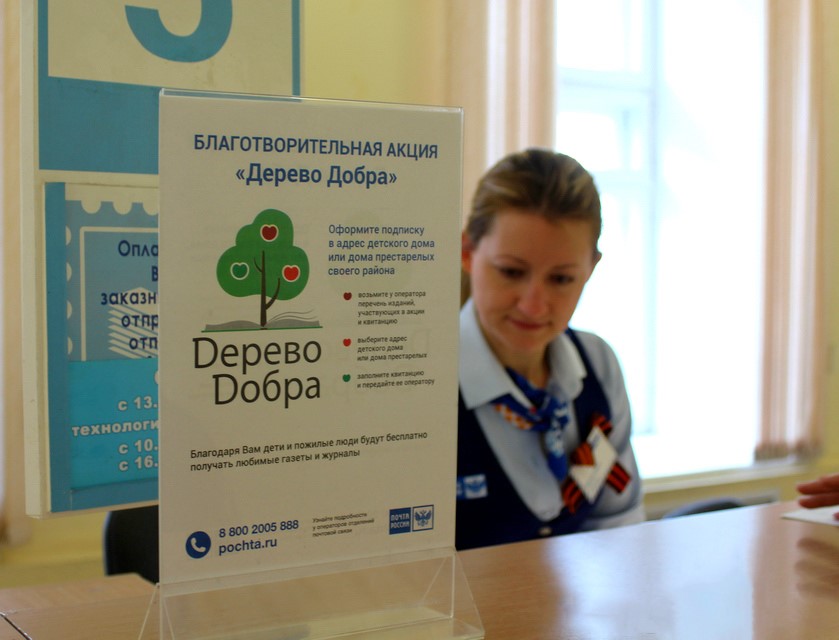 У Почты России есть постоянно действующая благотворительная акция «Дерево добра». Так, можно оформить подписку для воспитанников реабилитационных центров, детских домов, больниц, сельских библиотек или домов культуры. Сделать доброе дело могут частные лица и организации.