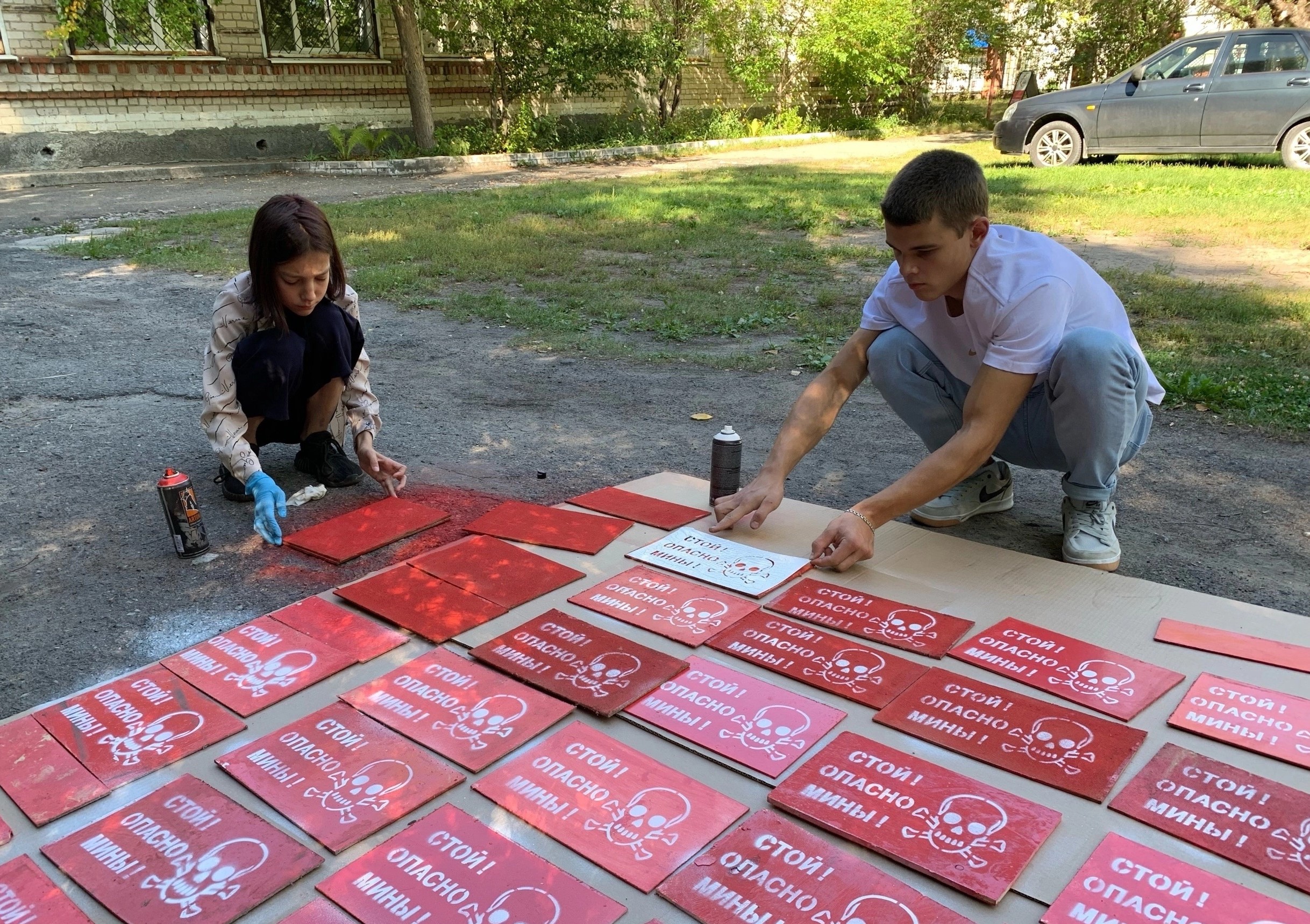 Волонтеры Боровского МО наносят на деревянные таблички краску, а после - с помощью трафаретов надпись «Стой, опасно, мины!»