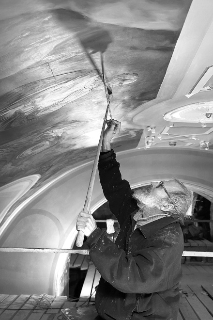 Художник говорит, что начинал как обычный живописец – писал портреты, пейзажи. Но однажды ему предложили попробовать себя в церковной росписи. Сейчас он всматривается в лицо на стене и говорит, что сам пытается представить себе состояние святого. И называет его: сосредоточенное созерцание.