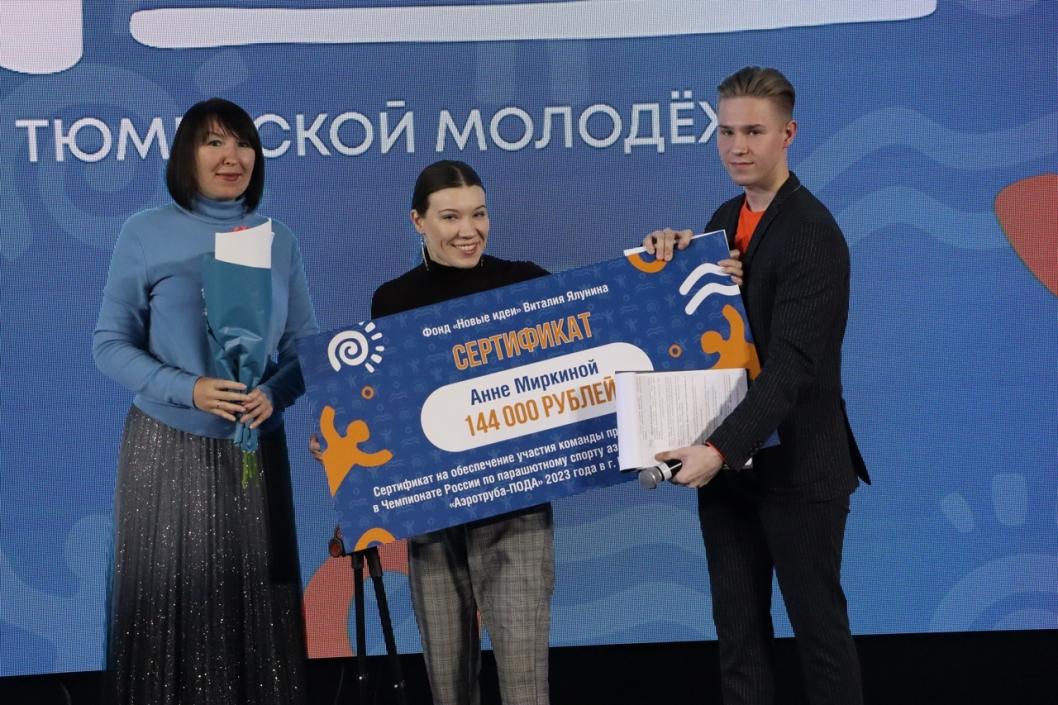 | Фото: департамент по спорту и молодежной политике ТюмениТакже специалисту по работе с инвалидами Ленинской окружной общественной организации Всероссийского общества инвалидов, автору проекта "Летать легко" Анне Миркиной вручили сертификат на 144 тыс. рублей. Он будет направлен на обеспечение участия тюменской команды в чемпионате России по парашютному спорту "Аэротруба-ПОДА" в Кемерово.