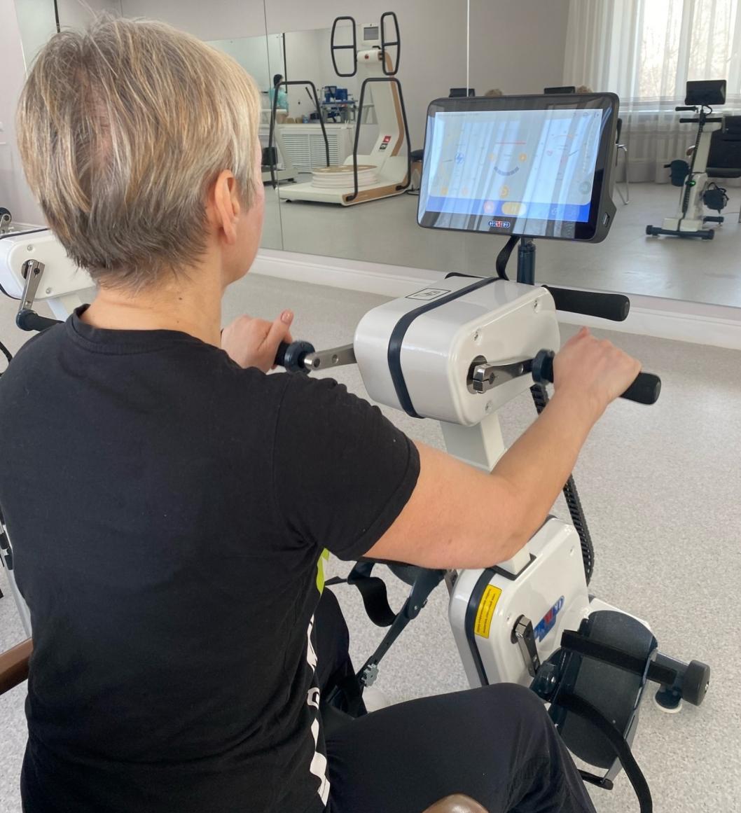 На современных тренажерах одновременно могут заниматься до 15 человек. На механотерапию приходят пациенты с различными заболеваниями: постковидный синдром, заболевания ЦНС, опорно-двигательного аппарата и ОНКО (мастектомия).