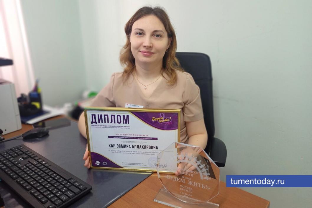 Вновь на сцену Государственного Кремлевского дворца выходят тюменцы. В первый день февраля здесь состоялось награждение победителей премии «Будем жить», вручаемой за особые заслуги в борьбе с онкологическими заболеваниями. В числе лучших – заведующая отделением медицинской реабилитации ГАУЗ ТО «МКМЦ «Медицинский город». Эсмира Хан стала обладателем звания «Лучший онколог для взрослых» . Работа тюменки заключается в реабилитации пациентов после хирургического, химиотерапевтического и лучевого лечения.