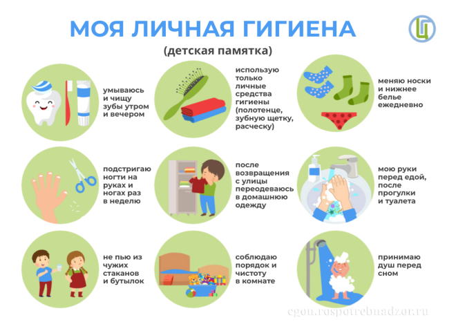 Необходимо чистить зубы. Каждое утро и вечер ребенок должен умываться. При этом мыть лицо, шею и уши. Перед сном не реже одного раза в два дня необходимо принимать душ. Вытираться следует только своим полотенцем.