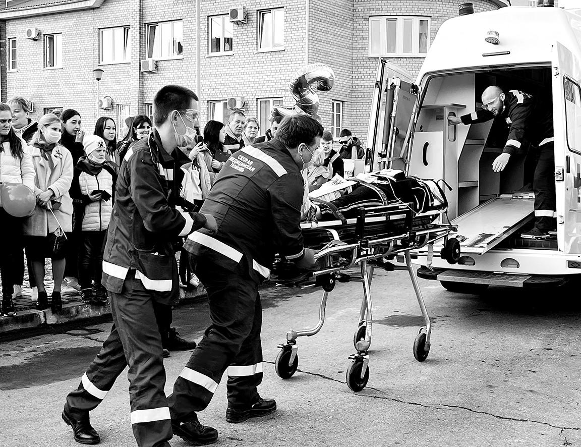 Помощь водителя нужна снова -погрузить пострадавшую на каталку и поместить в машину скорой помощи. Бригада справляется быстро, не мешкая ни минуты, главное — время. Отработали за четыре минуты, а вообще-то в реальных условиях работают гораздо быстрее.