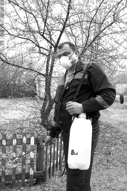 НА СНИМКЕ: сотрудник управляющей компании «Дом с добром» Евгений обрабатывает придомовую территорию в районе ДОКа.