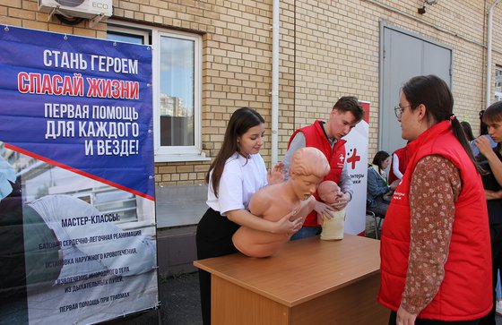 Волонтёры-медики устроили для педагогов школ флешмоб по сердечно-легочной реанимации , цель которого показать, насколько это просто и доступно. В течение 3 минут 30 учителей одновременно на 15 манекенах выполняли компрессии на грудную клетку. Спасти жизнь может каждый, для этого нужно руки сложить в замок и выполнять ритмичные надавливания на нижнюю половину грудины.
