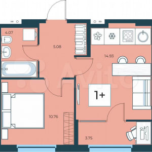 Однокомнатная квартира формата «плюс». Увеличенная кухня-гостиная с выходом на теплую лоджию, где вы сможете выделить зону для занятия работой или хобби. В коридоре выделена ниша для шкафа-купе, санузел совмещенный. В спальне также выделена ниша для шкафа-купе.