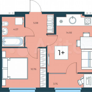Однокомнатная квартира формата «плюс». Увеличенная кухня-гостиная с выходом на теплую лоджию, где вы сможете выделить зону для занятия работой или хобби. В коридоре выделена ниша для шкафа-купе, санузел совмещенный. В спальне также выделена ниша для шкафа-купе.