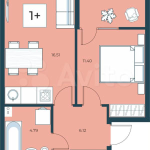 Однокомнатная квартира формата «плюс». Увеличенная кухня-гостиная - здесь могут собираться все члены семьи. В коридоре выделена ниша для шкафа-купе, санузел совмещенный. В спальне есть выход на теплую лоджию, где вы сможете обустроить место для работы или хобби.