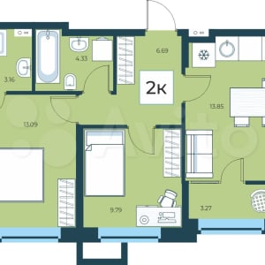 Двухкомнатная квартира линейной планировки, комнаты расположены в одну линию и все окна выходят на одну сторону дома. В коридоре выделена ниша для шкафа-купе. Увеличенная кухня-гостиная с лоджией - комфортное пространство, где могут собираться все члены семьи. Одна из спален увеличенной площади с отдельным санузлом и теплой лоджией.
